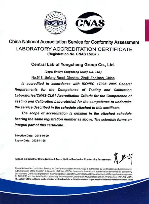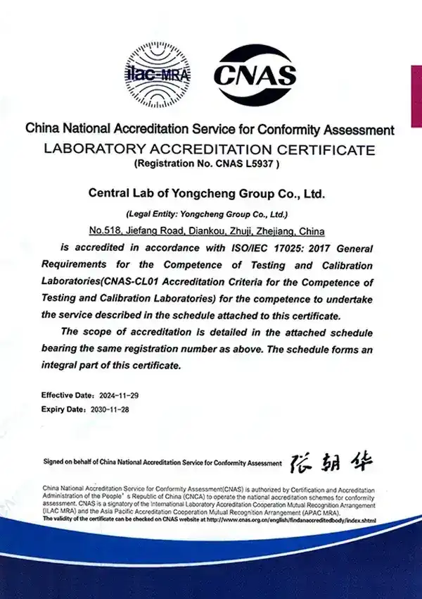 Notre laboratoire a obtenu l’accréditation CNAS pour ses compétences d’essais, avec des résultats reconnus dans le cadre de l’ILAC-MRA, couvrant 105 pays et économies. Le périmètre d’essais comprend la composition chimique, la dureté, la résistance à la traction, la métallographie, ainsi que des méthodes de contrôle non destructif (CND) telles que l’UT, le PT et le VT, en plus de l’inspection géométrique de pièces mécaniques. Tous les essais sont réalisés conformément aux normes internationales, notamment GB, ASTM, ISO, JIS et YS.